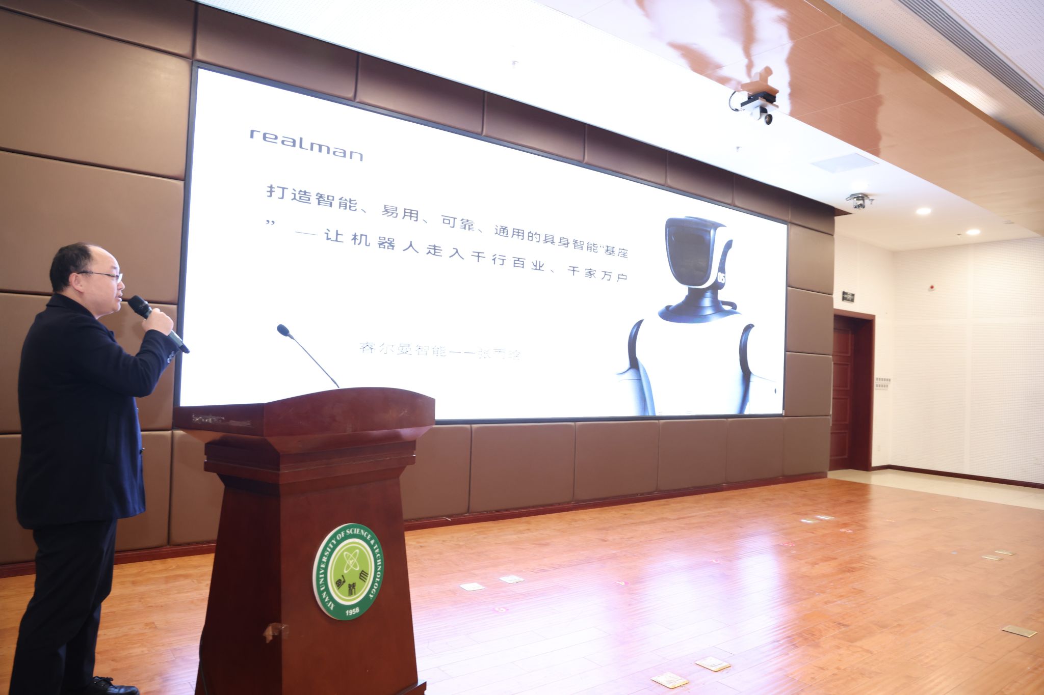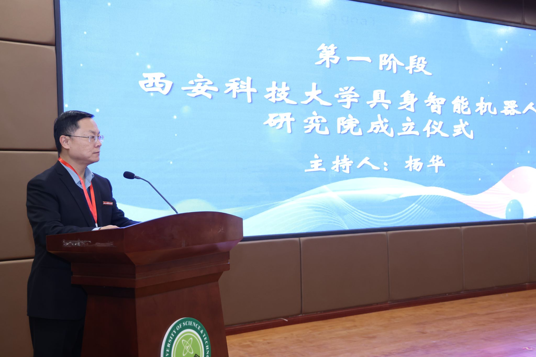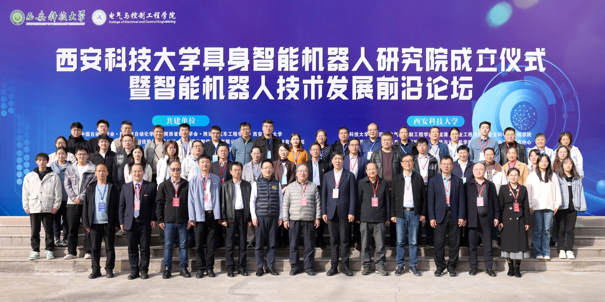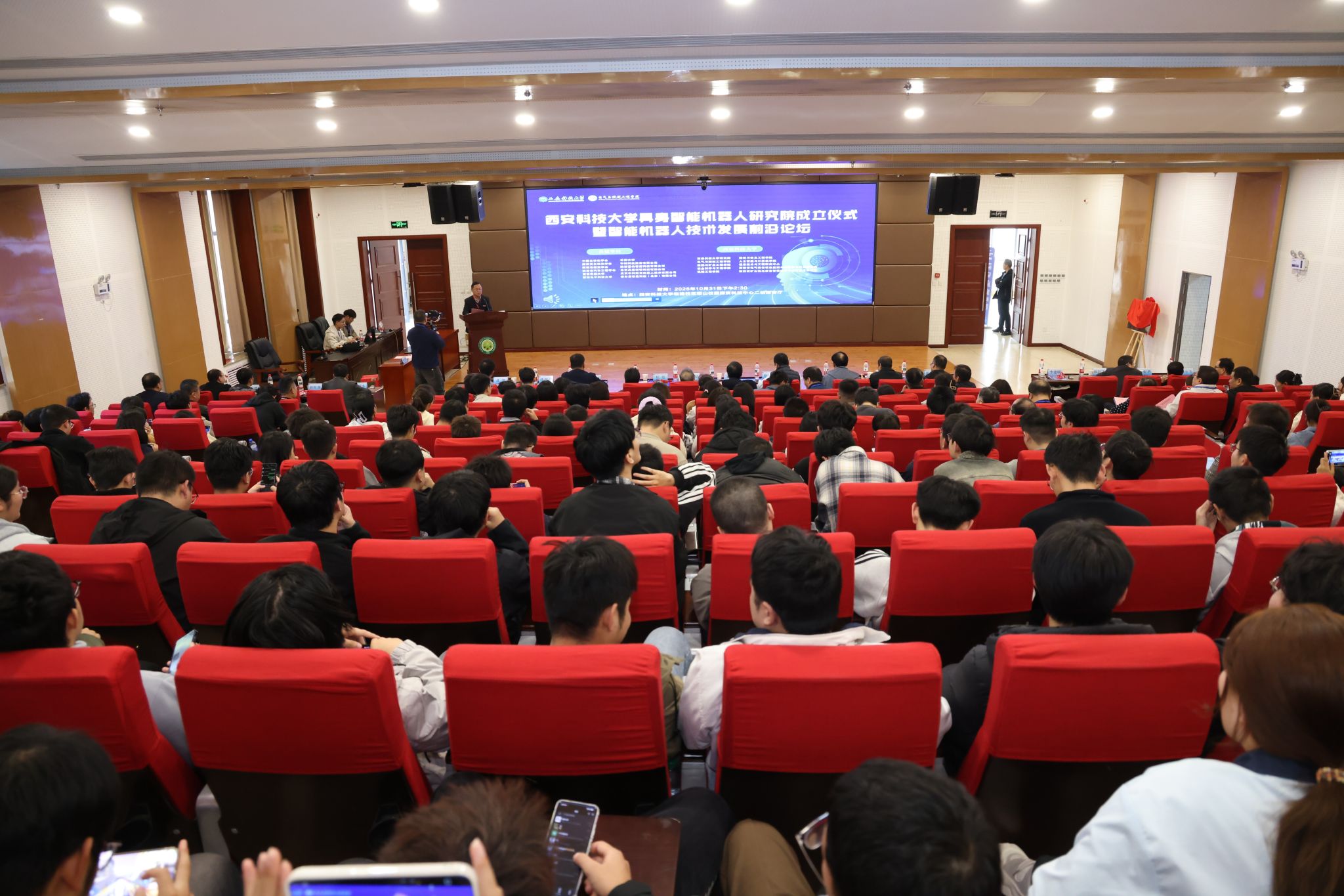 10月31日下午,西安科技大学具身智能机器人研究院成立揭牌仪式暨智能机器人技术发展前沿论坛,在我校临潼校区骊山校园煤炭科技中心二楼报告厅举行。中国自动化学会具身智能专业委员会副理事长、西安交通大学人工智能学院副院长孙宏滨教授、陕西省自动化学会副理事长、秘书长、西安交通大学自动控制研究所所长曹建福教授、陕西省煤炭学会常务副理事长惠维渊、秘书处干事薛煜亮、陕西省汽车工程学会常务副理事长、陕西汽车集团有限责任公司科技管理部部长刘大鹏、智能感知与图像理解教育部重点实验室副主任、西安电子科技大学人工智能学院执行院长侯彪教授、工信部新能源与智能网联汽车专家、长安大学汽车学院韩毅教授、苏州汇川技术有限公司校企合作西部总经理赵凯、陕西重构智信科技有限公司董事长兼总经理张西京、北京具能创智科技有限公司西北大区总经理刘红艳、北京中科慧灵机器人技术有限公司市场总监尹浩、睿尔曼智能科技(北京)有限公司经理张雨晗等应邀出席,我校副校长文虎,科技处、对外联络与合作处等职能部门以及安全科学与工程学院、人工智能与计算机学院、机械工程学院负责人以及相关学院师生共计300余人参加。揭牌仪式及前沿论坛由电气与控制工程学院党委书记杨华及院长寇发荣主持。