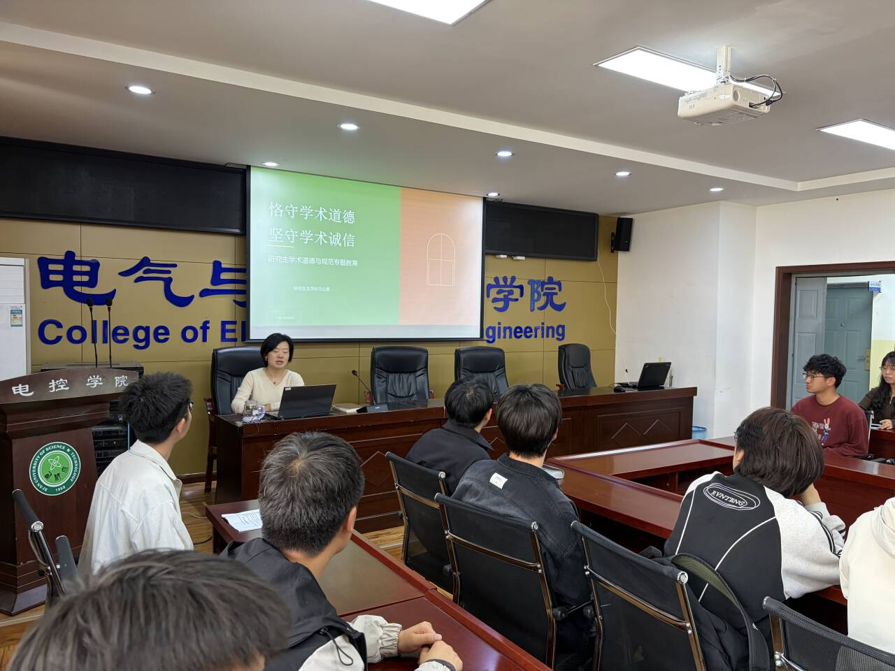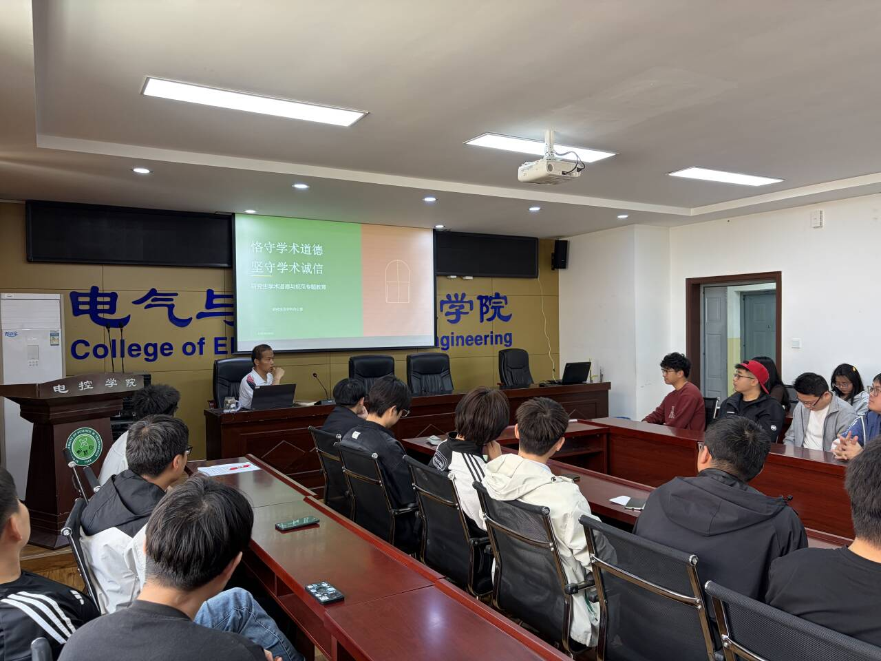 为进一步加强研究生学术诚信教育,严明学术纪律,培育优良学风,4月16日,电控学院研究生及学科办公室组织开展研究生学术道德与规范专题教育活动。活动由研究生辅导员王新智主持,研究生及学科办公室主任苗露、各年级研究生代表参加。
